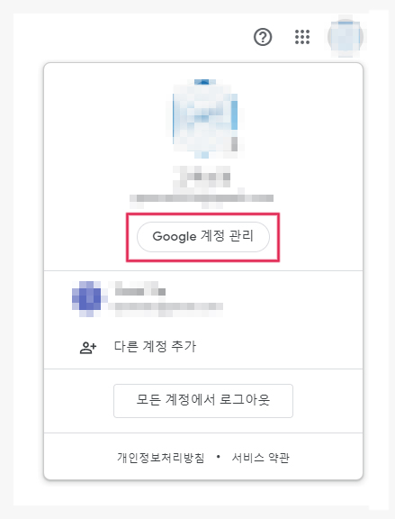 크롬 브라우저의 상단에 프로필 사진을 눌러 구글 계정관리 메뉴에 접속합니다.