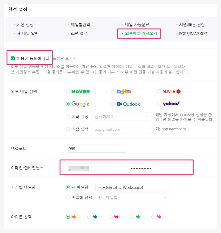 이 비밀번호를 CTRL+C 복사하여 네이버 외부메일 가져오기 페이지의 앱비밀번호 항목에 붙여넣기 해주시면 됩니다.