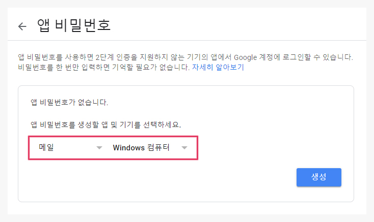 이 페이지에서는 앱 비밀번호를 생성할 앱 및 기기를 선택해야 합니다.