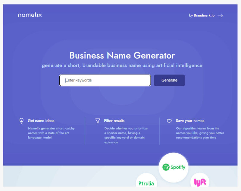 네임릭스는 생각하고 있던 브랜드네임을 입력하고 생성하기 버튼을 클릭하면 자동으로 유사한 브랜드네임과 다른 단어와 조합된 브랜드네임까지 생성하여 추출해줍니다.