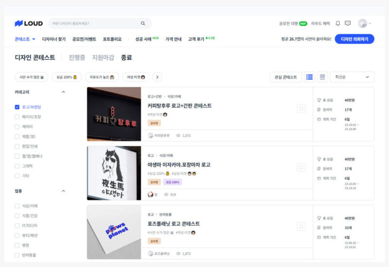 라우드소싱은 각 디자인 분야별 공모전을 개최할 수 있는 플랫폼 사이트입니다. 로고 제작의 경우 35만원~120만원 정도의 상금을 걸어 공모전을 개최할 수 있습니다. 콘테스트 등록 후 통상적으로 7일 후 참여작(결과물)을 받게 되는데 마음에 드는 결과물을 선택하고 디자이너와 채팅이 가능하게 되면 최종 결과물을 전달받고 상금을 승인하게 되는 형식입니다. 제가 사용해 보니 결과물의 만족도는 90% 이상의 수준이었습니다.