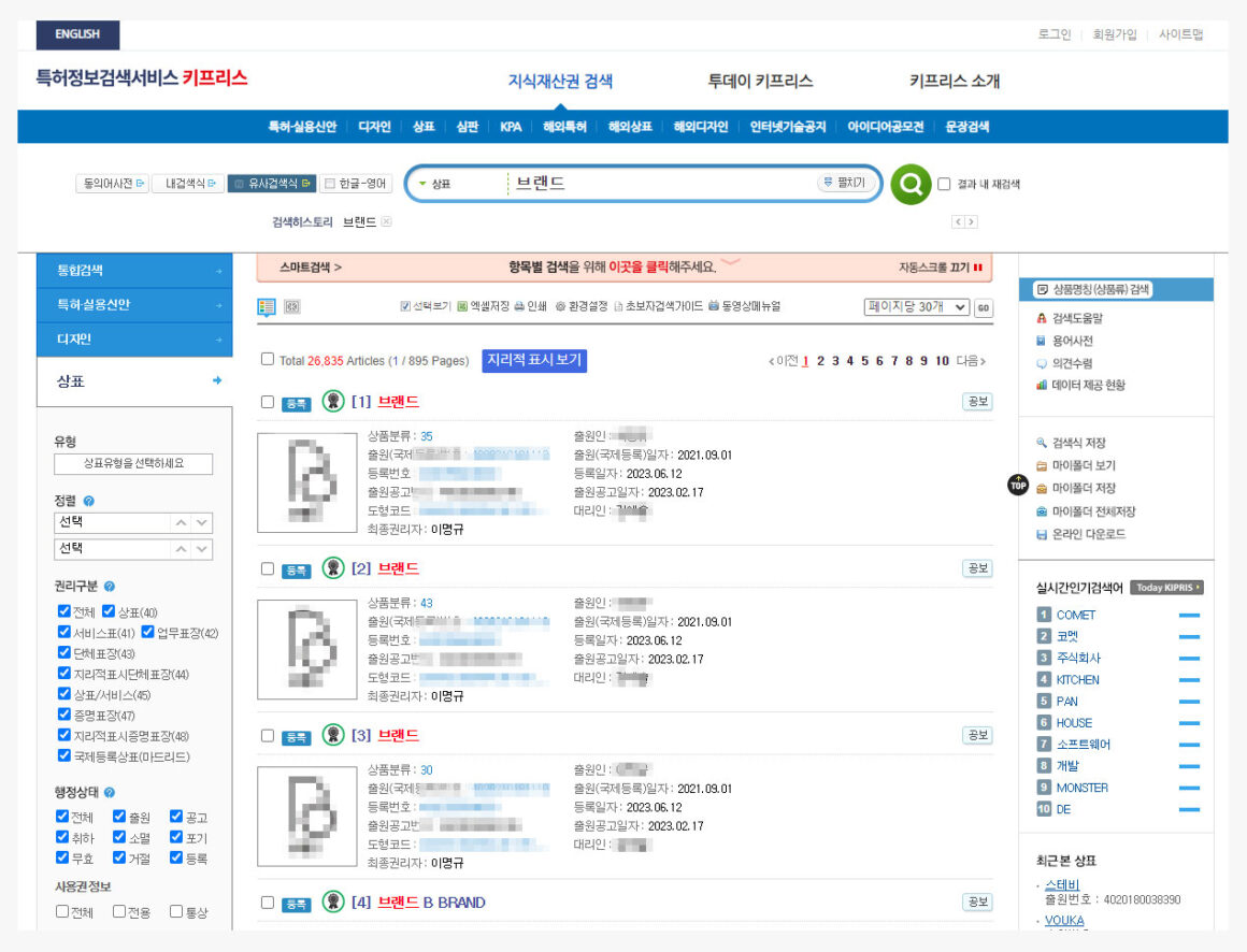 선행 상표를 확인하기 위해서는 키프리스 특허정보넷 홈페이지를 통해 조회가 가능합니다.