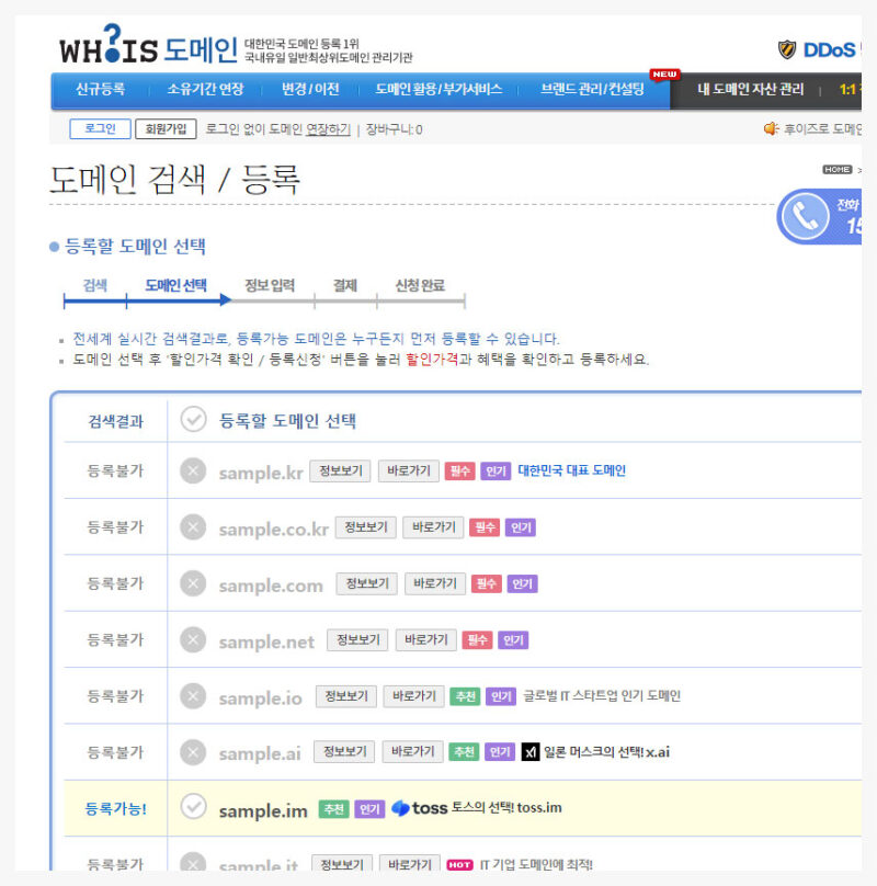 만약 이미 등록되어 있어 신규 등록이 불가한 경우에도 바로가기 버튼을 눌러 사이트에 한 번씩 접속해 보는 것을 추천드립니다. 그 이유는 해당 도메인을 판매 중 일 수 있기 때문입니다.